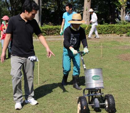コアリングの後は種蒔きを行いました。「サイクロン式肥料まき器」という道具を使って,均等に種が蒔けるようにします。「芝生スクール京都」の方にやり方を教えていただきながら,生徒も種蒔きをしました。