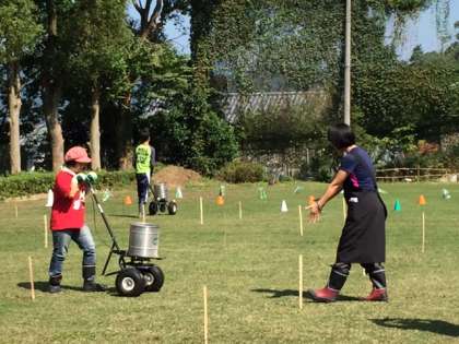 さわやかな秋空の下,NPO法人「芝生スクール京都」の皆さんと本校の高等部の生徒,教職員が一緒にグランドの冬芝のオーバーシーディングを行いました。