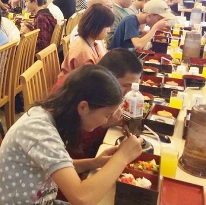 今回の修学旅行最後の食事です。みんな疲れもたまってくる頃ですが,元気に最後までおいしくいただきました。