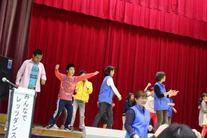 PTAのお母さま方によるダンスメドレーは『ポッキーダンス』『UFO』『恋ダンス』とパワフルに続き,最後の『フォーチュンクッキー』では,子どもたちも一緒に踊り,大変盛り上がりました