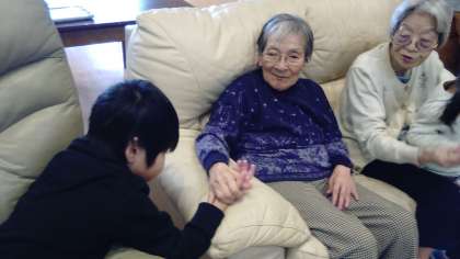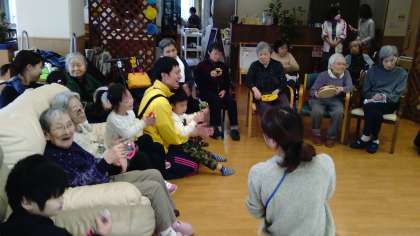 自己紹介の後、『しあわせなら手をたたこう』『大きな栗の木の下で』などの手遊びをしておじいちゃん、おばあちゃんと触れあいました。