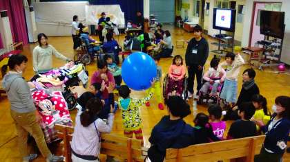最後は,二つのチームに別れて風船リレーをしました。大きな風船にみんな大喜び!