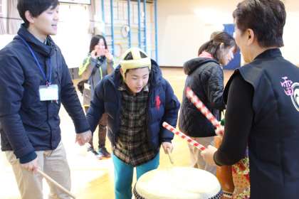 リズムに合わせて叩いたり,雷さんと視線を合わせながら一緒にバチを持って叩いたりしました。