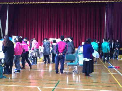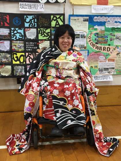 9日(土)呉竹総合支援学校を会場に,総合支援学校PTA連絡協議会主催の「はぐくみ情報展」が開催されました。教育・福祉・企業等からまさに「情報満載」の内容で,たくさんの方に来場いただきました。本校生徒も,姿勢保持により活動を支援する器具の「スパイダー・システム ユニバーサルフレーム」を体験をしたり,簡単に着付けできる晴れ着を試着しました。後姿も素敵なんですよ。