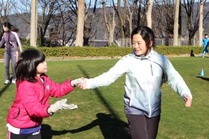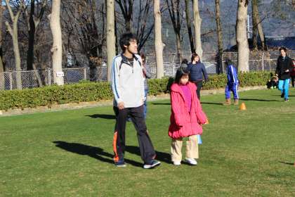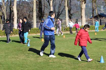 風は冷たいですが,日の当たるグリーンの芝生の上でランニングをするのは,とても気持ちよさそうです。