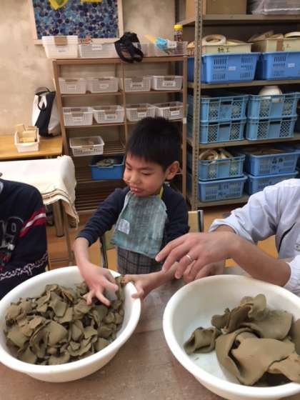 型抜きした粘土を細かくちぎる作業をしたり,釉薬をつけたりしています。