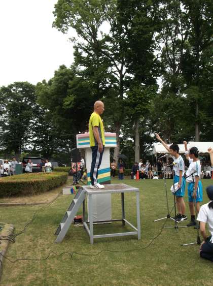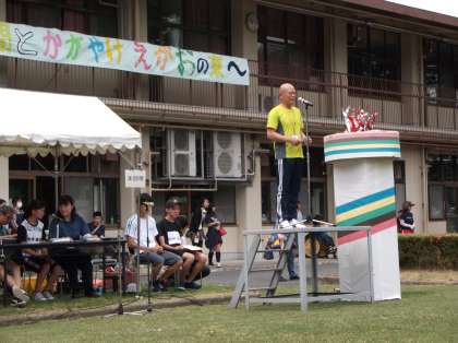 校長先生からは「体育祭テーマにあるように,仲間と協力し,競技を楽しみ,笑顔で輝けるように頑張りましょう。」とお話がありました。その後,児童生徒会の代表が中央に集まり選手宣誓を行いました。