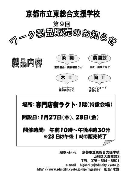 1月27日(木),28日(金),専門店街ラクト様,大丸山科店様のご協力を得て,専門店街ラクト1階特設会場におきましてワーク製品販売をおこないます。開店は,朝10時から夕方の4時30分までです。今回も,陶器,木工品,布製品,農園芸品をたくさんご用意して,生徒,教職員一同,皆様のご来店を心からお待ちいたしております。なお,チラシは本ページ右下の「配布文書」欄からも印刷できます。