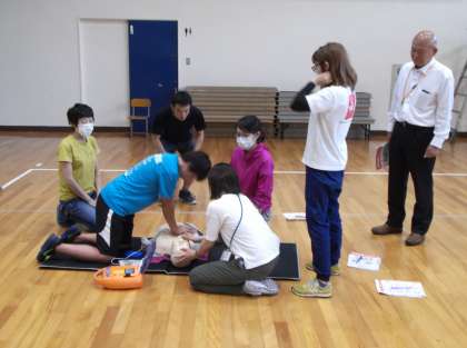 お話の後,グループに分かれて第3の輪「一次救命処置」の心肺蘇生法の実施とAEDの使用について実習を行いました。