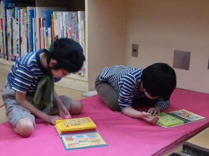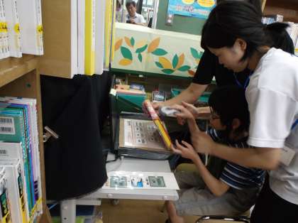 図書室では図書・美化委員会を行いました。「借りた本の返し方」,「ポスターづくり」「じゆうよみ」などを行いました。パソコンを使い本の返却手続をしたり,一人一人が好きな本を紹介したカードを模造紙に貼りつけポスターをつくりました。また,じゆうよみでは,自分の好きな本を手に取り楽しみました。