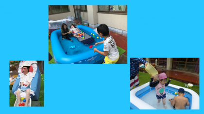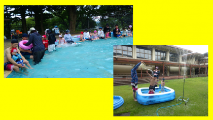 大プールや小プール,南庭や中庭の大きなビニールプールで元気いっぱい水に触れました。