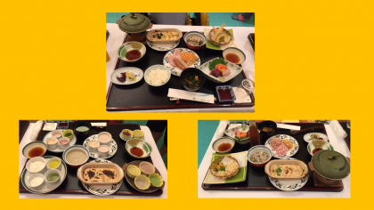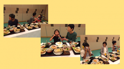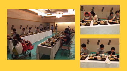 今日1日活動してみんな腹ペコです。テーブルにならべられた美味しそうなごちそうを,みんなパクパク食べ,お腹いっぱいになりました。