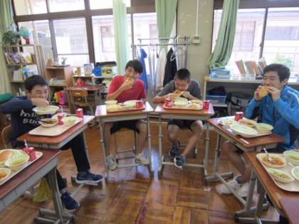 フォークを使って,「コッペパン」に「ソース焼きそば」を挟んで,「やきそばパン」にして食べていました。