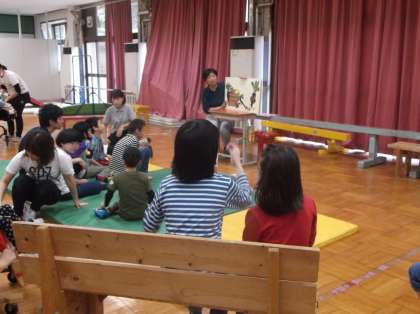 ホールに集まった児童たちは,最初に「にんじんとごぼうとだいこん」のお話を聞きました。話のはじめに,実物のにんじん・ごぼう・だいこんが提示されると興味を持って大型絵本に見入って話を聞いていました。