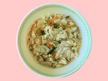 ゆばあんかけうどんは,昆布とかつお節からとる「あわせだし」に,ゆばと5種類の野菜を加え,しょうゆなどの調味料で味つけをした後,かたくり粉でとろみをつけて仕上げました。京都らしいと,とても好評でした。