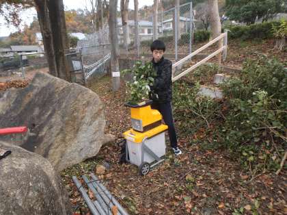 午前中の木工班の活動では,校内の樹木を剪定した枝を再利用して木のチップを作りました担当する生徒が積まれている枝を一本一本機械に入れてチップを作りました。できたチップは校内の花壇の通路などに敷いて使います。
