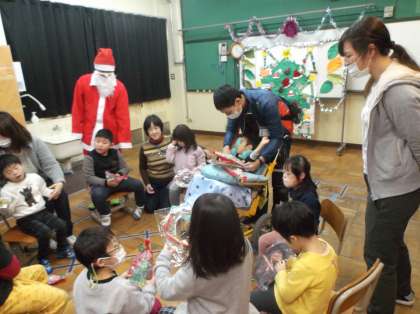 サンタさんとクイズをしたり,みんなで音楽を楽しんだりしました。また,それぞれの学年で作ったプレゼントを交換したときは,受け取ったプレゼントを見て笑顔を見せていました。
