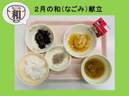 今日は2月の和(なごみ)献立でした。「がんもどきのあんかけ」は,豆腐,おから,鶏ひき肉,にんじん,しいたけ,枝豆に米粉,塩,こしょう,しょうゆを加えて混ぜ合わせ,ひとつずつ丸めたものに,油をかけてオーブンで焼いて仕上げています。また,だし汁,三温糖,しょうゆを加熱して,片くり粉でとろみをつけたあんを教室でかけて食べました。ふんわりと仕上がったがんもどきがおいしいと好評でした。