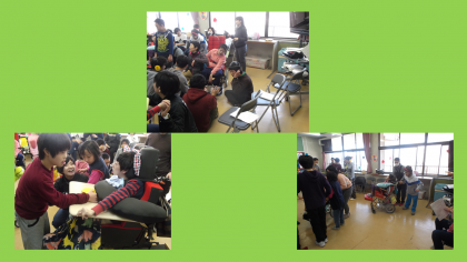 生徒会が司会進行を担い送る会が始まりました。プログラムの紹介に続いて,みんなでゲームをしました。音楽に合わせて自由に動き,音楽が止まると生徒会が示した人数のグループを作るゲームや全員で大きな輪になり4個のボールを隣りに次から次へと送るゲームをしました。どちらのゲームも大変盛り上がりみんなとても楽しんでいました。