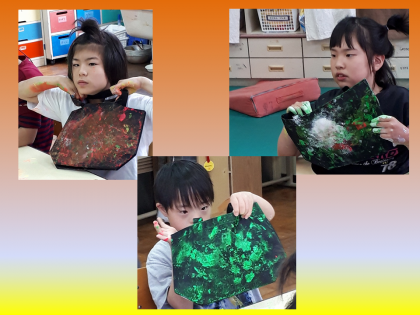 出来上がった『マイバック』をみんな誇らしげに見せ合い「次はこれを持ってお買い物に行くぞ〜!」と次の学習が待ちきれない様子でした。終わりのあいさつでも『マイバック』を離さず,めいいっぱいアートを楽しんだ学習でした。