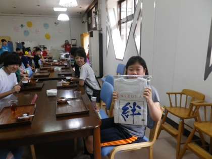 先日,中学部「地域サービスユニット」から「Tシャツに絆の文字を入れてほしい」との依頼を受けて,「絆Tシャツ」を染色しました。合計18枚の白のTシャツの背中に「絆KIZUNA」の文字を前みごろに東の校章を染色しました。一人では文字入れが難しいので2人で協力しての染色を行いました。本日にランチルームで活動されている「地域サービスユニット」に届けました。お礼にと,喫茶サービスに招待して頂きました。染織デザイン班のメンバーは,「地域サービスユニット」の生徒さんからコーヒー,紅茶のサービスを受けてほっと一息つくことができました。