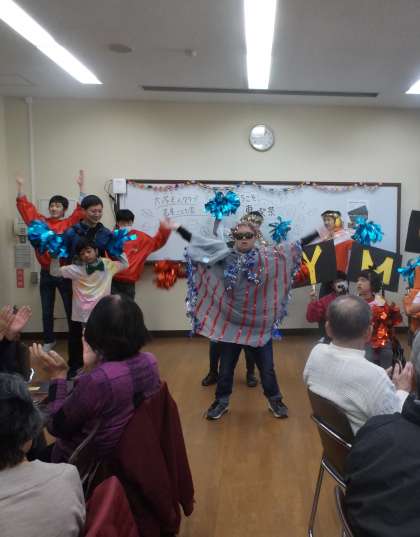 体 育館の広いスペースで共同制作を行うグループ,一緒に仲良く様々なレクリエーションを楽しむグループ,地域住民の方々や児童館のみなさんをお迎えして地域貢献や交流を行うグループなどなど。
