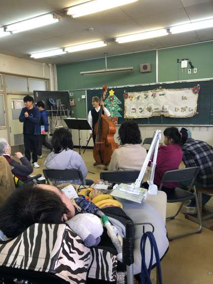 後半の音楽交流会「ウィンターコンサートin東」では,バイオリンやコントラバス,ハーモニカなど,山科苑の方々が演奏くださいました。本校の生徒もタンバリンや鈴など使ってリズムを刻みました。秋やクリスマスをテーマにして,「紅葉」や「きよしこの夜」,「ジングルベル」など演奏してくださいました。「世界に一つだけの花」はみんなで体をゆすったり,踊ったり,楽器を鳴らしたり盛り上がりました。山科苑の皆さん,ありがとうございました。