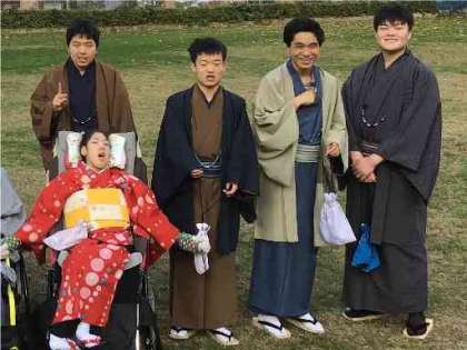 高等部2年生で「着物の着付け教室」を行いました!業者の方に教えて頂きながら着物に着替えた後,紅葉をバックに記念撮影をしたり,職員室で先生方に普段と違った姿をお披露目したりしました。普段とは違った服装で過ごす体験の中で,生徒の生き生きとした表情が見られました!