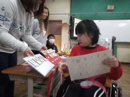 お父さん,お母さんに店員役をしてもらい買い物学習に取り組む小学部のユニット。