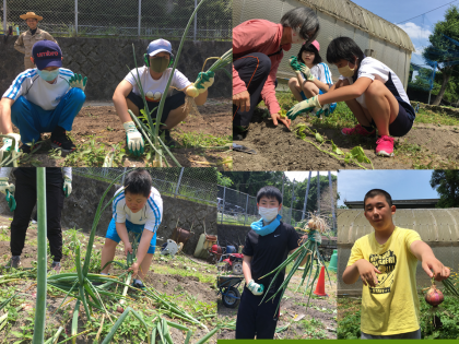 2年生はワークスタディ農園班の友だちがみんなをリードして苗植えや、玉ねぎの収穫を行いました。芋の苗を植えてから優しく水やりをしたり、汗をかきながら一生懸命玉ねぎを抜いたりする姿が見られました。