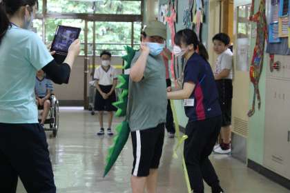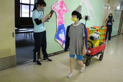 2年生「ソーシャルディスタンス」ソーシャルディスタンスの目安になる物を持ってランウェイを歩きました。
