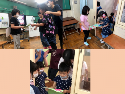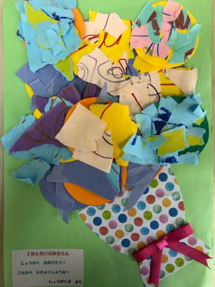そして,自己紹介が終わると,各教室に新入生と転入生の児童が行き,2〜6年生の児童が作ったプレゼントのブーケを受け取りました。