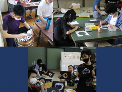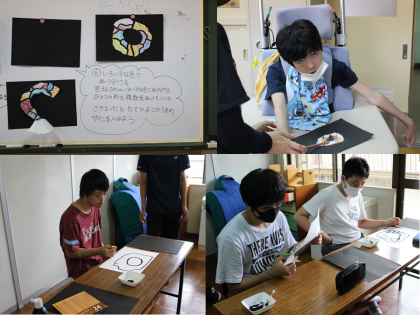 綿棒を墨汁につけて,丸い形を描き,ドーナッツの形の中に線を入れて好きな色に塗りました。それぞれの個性豊かな,ドーナッツが出来上がりました!