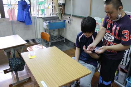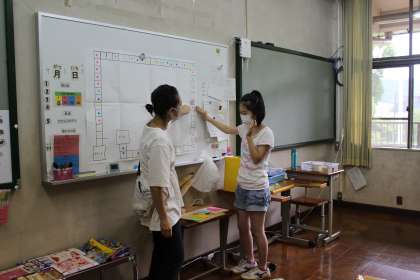 サイコロをころがし,止まったマスの色とカードのマッチングをして,カードに書かれてる指示にしたがい買い物をしたり,友達とやりとりをしたりと,楽しい雰囲気の中,色・数字・お金の学習をしました。