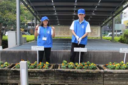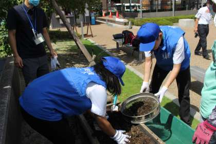 京都市役所前の広場の花の植え替えをしました。ほっとはあとの方の指示を真剣に聞き,次どうすればいいのか質問したり,「できました」と報告したり,暑い中でしたが,最後まで積極的に作業できました。〜東総合支援学校の高等部が植え替え作業のお手伝いをしています〜とプラカードにかかれています。