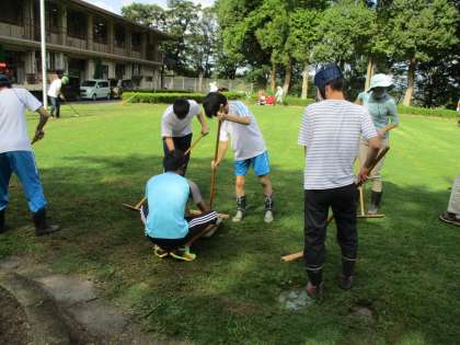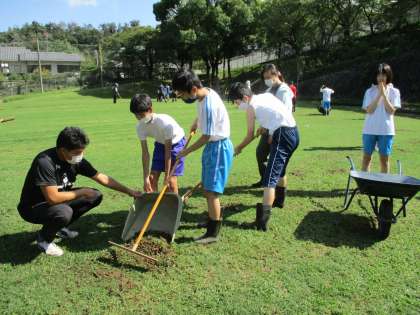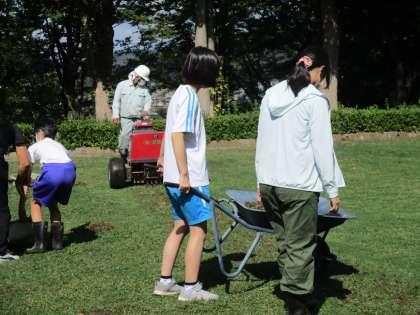 さて,今日はグラウンドの冬芝の種植えをする日でした。朝早くから,NPO法人の芝生スクールのみなさんも来ていただきました。本校からも中学部,高等部の生徒がたくさん手伝いに来てくれました。みんなで協力をして,本校の大きなグラウンドも午前中で全工程を終えました。