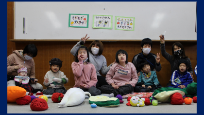 野菜をもぎとりに行く前にウォーミングアップ。腹筋頑張っています!そのあとは,紐にぶら下がっている野菜をもぎ取りに,坂をこえたり,手を伸ばしたり,かごを押したり。とった野菜を友達に渡したり。みんなの力でたくさんの野菜を集めました。最後にもぎとった野菜の前で,「とったどー」とポーズです!