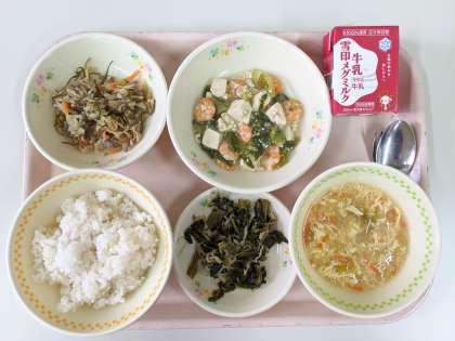今日は「えびととうふのくず煮」に使用しています。作り方は,けずりぶしでだしをとり,塩としょうゆで味を調え,豆腐を煮ます。その中にゆでたチンゲン菜と料理酒で臭みをとったむきえびを加えて煮ます。最後に水溶き片栗粉,しょうがのしぼり汁を加えて仕上げています。味わって食べてください。