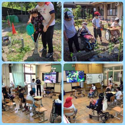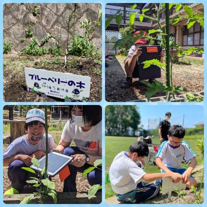 中庭にトマトとナス、農園芸の畑にサツマイモ、運動場にブルーベリーを植えて日々世話をしています。