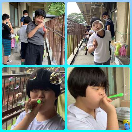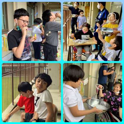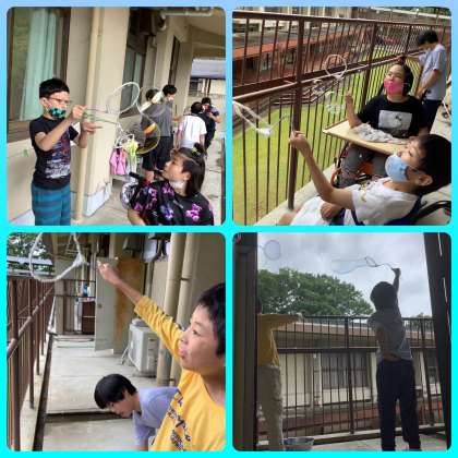 新型コロナの影響で今日予定されていた科学センター学習が中止になりガッカリしている生徒も多くいましたので,中学部1年学年ライフでは巨大シャボン玉つくりに挑戦しました!ハンガーで作った枠を使って顔よりも大きなシャボン玉を作ることができました。フワフワ浮かぶ大きなシャボン玉を見てみんな大喜びでした。