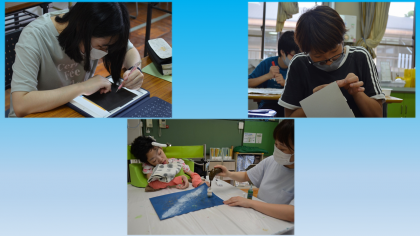 棒スイッチを頭で操作し,指導者と一緒に画用紙に作品を描いている生徒もいます。仕上がった作品は,『七夕』『アジサイ』『花火』をテーマにした素敵なものになりました!