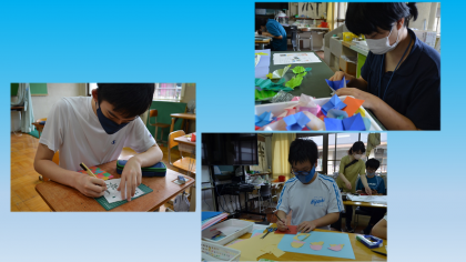 東タイム「造形」の授業では,折り紙を折ったり,切り絵にしたりして季節を感じられる作品に取り組んでいます。タブレット端末の画像を見てイメージを膨らませて作る生徒や,見本を見ながら作る生徒など,思い思いに手を動かしていました。