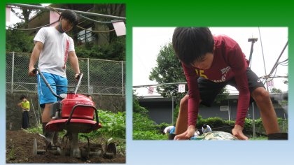 蒸し暑い中,農園の生徒たちは,それぞれの作業に取り組んでいました。耕運機を操作して土を耕したり,畑作りのために肥料を撒いたりしました。また,畑の周りの除草をする生徒もいました。