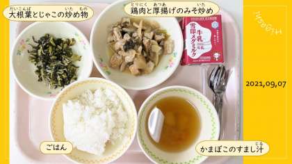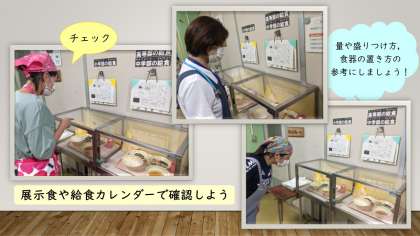 給食室の前にある展示食や給食カレンダーを見ると,量や盛りつけ方,食器の置き方がわかります。みなさんのトレーの上も,正しい位置に配膳できていますか?