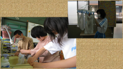 汚れた雑巾をもみ洗いし汚れを落とし,物干しハンガーに干すことに取り組んでいました。できたことを報告する姿も見られました。