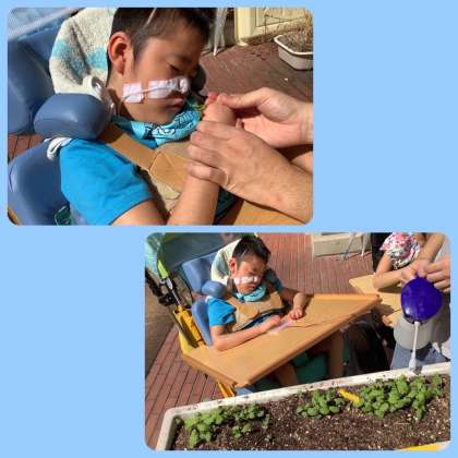 育った植物を触ったり匂いを嗅いだりした後,種まきや水やりをしている様子です。