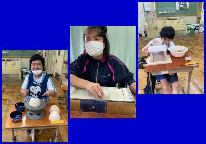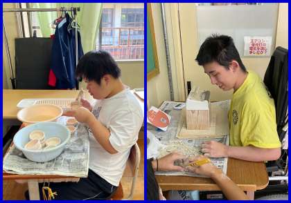 陶工の作業の一部を紹介します。シュレッダーを使って,再生粘土づくりをしています。つぎつぎに手を止めることなく楽しんで作業しています。素焼きした豆皿のふきとりをしたり,磨いたりしています。ひとつひとつ丁寧に気持ちをこめて作業しています。お椀に撥水材を塗っています。ひとつひとつ集中して作業しています。その他にもいろいろな作業があります。ひとりひとりが自分の役割を時間内やりきれるように日々頑張っています。