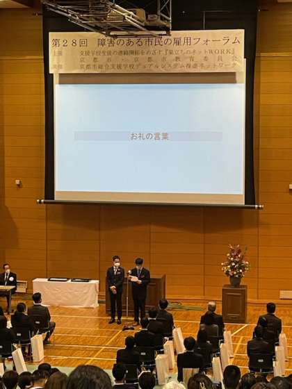 「第28回障害のある市民の雇用フォーラム」が京都市総合教育センターにて行われました。このフォーラムは,企業・事業所の皆様に総合支援学校の教育内容や障害のある市民の雇用について,ご理解いただく機会として毎年開催しています。