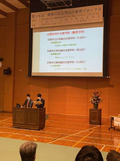 第二部では,京都市総合支援学校の進路の取組について今回は鳴滝の生徒と本校進路指導主事が話をしました。その後,実際に障害者雇用をされている企業様が「実習の受け入れ雇用1年目を終えて」をテーマにご講演いただきました。