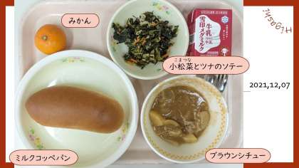 「シチュー」とは,肉・魚介類・野菜などを煮込んだ料理のことです。今日の給食は,うす切りの豚肉,じゃがいも,にんじん,たまねぎが入っています。